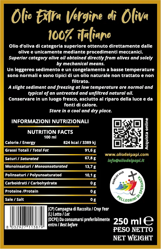 Edizione speciale Giubileo 2025, con olio EVO italiano pluripremiato, estratto a freddo e 100% tracciabile.