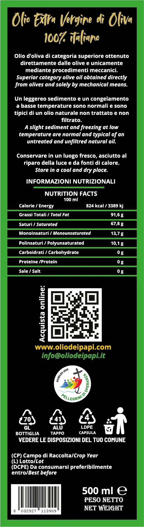 Edizione speciale Giubileo 2025, con olio EVO italiano pluripremiato, estratto a freddo e 100% tracciabile.